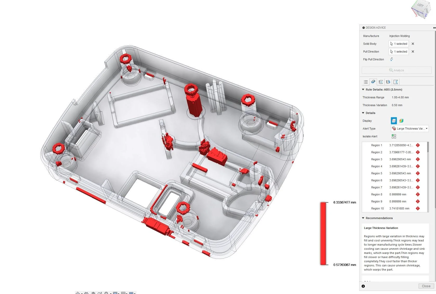 Laten we beginnen met de behuizing. Op het fysieke kunststof onderdeel waren duidelijke visuele gebreken zichtbaar, zoals inval aan de voorkant en zijkant, evenals onvoldoende vulling van sommige delen. Hoewel de inval aan de zijkant tijdens de engineering minder aandacht kreeg, omdat hier nog een kap overheen zou komen, resulteerde dit in een minder aantrekkelijk uiterlijk van het product totdat de kap werd geplaatst. Analyse tijdens de engineering onthulde al enkele wanddikteverschillen, maar deze verschillen waren niet groot genoeg om enorme inval te verwachten. De vraag is of de simulatie andere resultaten zou laten zien dan de check tijdens de engineering, maar dit bleek niet het geval te zijn. Hoewel er enige inval werd verwacht, was deze in de simulatie ook beduidend minder dan in de werkelijkheid.